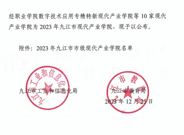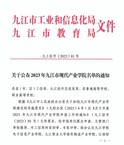 近日,九江市工业和信息化局与九江市教育局联合发布公告,经过严格的评审和筛选,beat365官网电子信息产业学院被正式认定为2023年九江市现代产业学院。此次共有10家现代产业学院被认定为2023年九江市现代产业学院,beat365官网电子信息产业学院排名第一。
