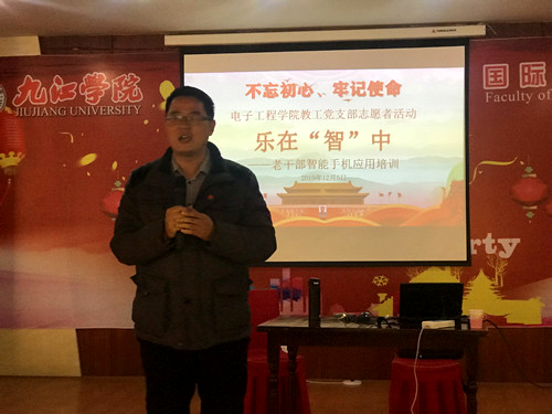 为扎实开展“不忘初心、牢记使命”主题教育工作,12月5日下午,电子工程学院教工党支部联合离退休职工管理处在学校老干部活动中心开展了题为《“乐在‘智’中”——老干部智能手机应用培训》的志愿者活动,30余名离退休老教师参加了本次培训。