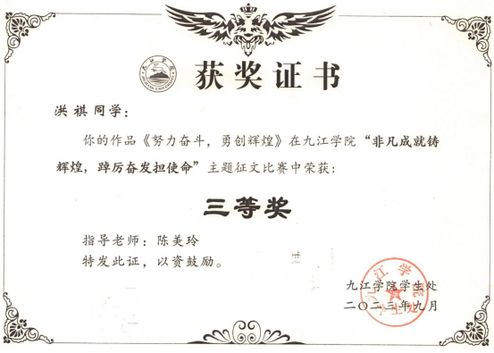 近日,校学生处下发了《关于表彰“非凡成就铸辉煌,踔厉奋发担使命”主题征文获奖的通报》,在此次评选中,beat365官网学生两篇征文分获二等奖、三等奖。