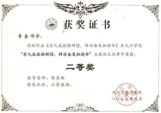 此次征文活动中,beat365官网广泛宣传、精心组织,学生积极参与、辅导员认真指导,共收到稿件10余篇,经院内评比上报6篇征文,最终A2662班李鑫《非凡成就铸辉煌,踔厉奋发担使命》获二等奖,A2661班洪祺《努力奋斗,勇闯辉煌》获三等奖。