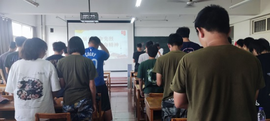 全体同学高声齐唱中华人民共和国国歌后,全场肃立,向为国捐躯、英勇献身的革命烈士默哀。默哀结束后,各班团支书带领同学们学习革命先烈的英勇事迹,讲述他们的革命故事,让同学们在缅怀革命先烈的丰功伟绩的基础上加深对民族精神含义的理解。之后,各班同学积极分享自己所知道的革命先烈及英雄事迹,被先烈崇高的精神所感动,纷纷表示要刻苦学习,为实现中国梦奉献智慧和力量,传承革命先烈的精神。