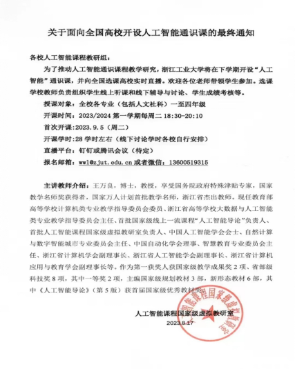 电子工程学院人工智能专业积极响应教育部“慕课西行”号召,参加全国人工智能虚拟教研室同步课堂活动,实现优质教学资源的互联互通。国家教学名师王万良教授主讲的“慕课西行——浙江工业大学人工智能同步课堂”于2023年9月5日晚上18:30正式在钉钉群开播,吸引了校内外几千名学生和教师收看学习。beat365中文官方网站、宁夏理工学院、三峡大学、沈阳建筑大学、河北师范大学、西安培华学院、浙江工业大学等高校组织学生集中参加了人工智能同步课堂学习。该课程每周二晚实时直播,共28学时左右。