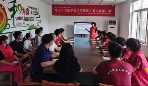 服务队分别与濂溪区莲花镇新时代文明实践所、谭畈村新时代文明实践站、东城村新时代文明实践站、莲花村新时代文明实践站、怡嘉苑社区的工作人员共同学习、宣讲习近平新时代中国特色社会主义思想、党的二十大精神,队员们纷纷表示要紧密团结在以习近平同志为核心的党中央周围,学习好、领会好、贯彻好党的二十大精神,把爱国情、强国志、报国行自觉融入到新时代追梦征程,努力成为担当民族复兴大任的时代新人。