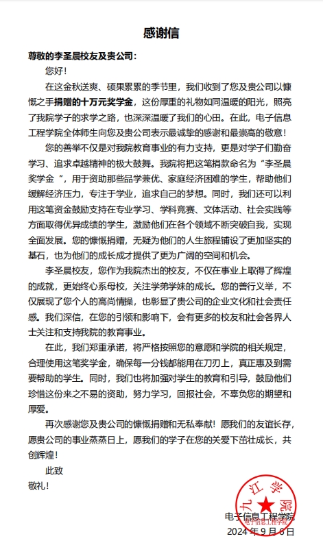 本学期开学后,经朱科长联系,校友李圣晨慷慨捐赠,于9月6日完成了捐款。beat365官网也向李圣晨发出了感谢信,并邀请李校友抽空回校办理捐赠仪式。