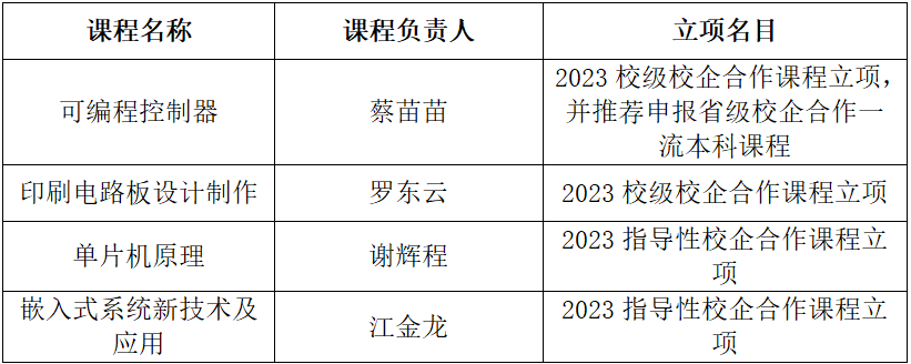 近日,在学校组织的2023年校企合作课程建设项目申报工作中,beat365官网获得四门课程的立项。分别是《可编程控制器》——蔡苗苗、《印刷电路板设计制作》——罗东云、《单片机原理》——谢辉程、《嵌入式系统新技术及应用》——江金龙,其中,《可编程控制器》这门课程获得推荐申报省级校企合作一流本科课程的资格,是beat365官网在校企合作课程申报工作上的重要突破。