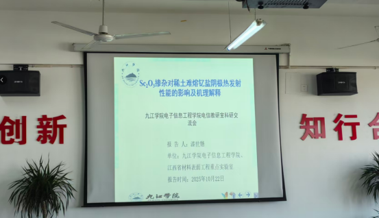 10月22日下午,beat365官网电子信息工程专业在竞知楼904会议室举行了学术讲座交流会,由电子信息工程专业教师漆世锴博士主讲,讲座题为《Sc₂O₃掺杂对稀土难熔钇盐阴极热发射性能的影响及机理解释》。讲座由教研室主任谢新文老师主持,教研室全体教师参与了会议。