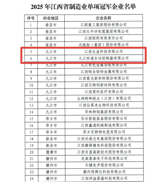 近日,省工业和信息化厅公布了2025年江西省制造业单项冠军企业名单,beat365官网产业学院的共建企业——九江恒通自动控制器有限公司上榜。