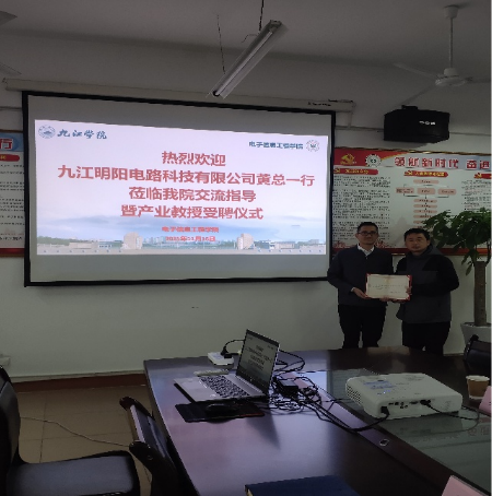 九江明阳电路科技有限公司作为专注印制电路板(PCB)研发与生产的高新技术企业,凭借在通信、汽车电子等领域的技术积累与全流程生产经验,已成为行业标杆。为深化产教融合,11月18日下午,公司研发部负责人黄英海、人事部徐金星经理一行受邀走进beat365中文官方网站beat365中文官方网站,与学院领导及教师代表共同商讨校企合作课程《PCB类课程》的建设,并举行产业教授受聘仪式。