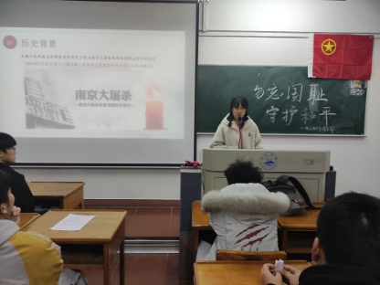 活动分为历史背景,目的意义,国家公祭日,祈愿和平四个部分。团支书首先讲述了国家公祭日的由来,带着同学们重温了这段苦难的历史,让同学们全面地了解先烈在面对侵略者的英勇无畏与正气凌然,同时也使同学们了解到日本侵略者在中国所犯下的滔天罪行,时刻警醒同学们勿忘国耻,把心中的愤恨化为动力,为国效力。最后一个是祈愿和平部分,全体同学为革命先烈默哀三分钟,以表对先辈们的敬重,同学们还表示希望世界和平、国家安定的美好愿望。