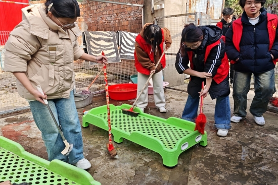 活动当日,同学们满怀热忱地汇聚于我校西门,在学长学姐的引领下,井然有序地向流浪猫狗收留基地进发。志愿者们分工明确,各司其职,展现出了团队协作的精神。在沙石飞扬的场地上,一些志愿者紧握铁锹,汗水与沙土交织,他们全力以赴,为流浪狗打造一个更加温馨的家园。在狗棚的角落里,另一些志愿者默默地清理着粪便,他们的细心与耐心,为流浪狗提供了一个更干净的生活环境。楼道间,红色的身影快速穿梭,他们忙碌地搬运着猫砂和猫粮,为流浪猫的生活提供保障。还有志愿者专注地清洗着动物们沾满污渍的床铺,他们的努力让这些小生命能够拥有一个更舒适的休息之地。在忙碌的工作之余,志愿者们也不忘与猫猫狗狗亲昵嬉戏,他们用温暖的陪伴,慰藉这些小生命孤寂的心灵,让它们感受到人类的关爱。