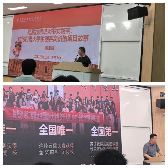 我校优秀校友、江西师范大学资产与实验室管理处处长王钠带来关于红旅项目突围之道,专题分享。王处长以近年国赛金奖为典型案例深入剖析了红旅项目的特色优势、发展瓶颈及突破路径,为师生们提供了宝贵的实战指导。