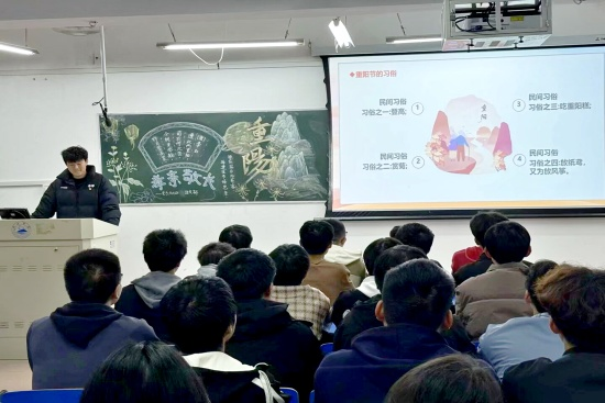 班会于晚上七点准时开始,各班级团支书担任主讲人,围绕重阳节的起源、习俗、文化价值与现实意义展开生动讲述。主讲人首先追溯重阳节的历史脉络——从春秋时期的雏形,到唐代的初步定型,再到宋明时期的繁荣发展,娓娓道来这一传统节日深厚的文化底蕴。