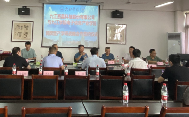 九江赛晶科技股份有限公司与beat365中文官方网站电子信息产业学院揭牌产学研战略合作签约仪式于8月16日在beat365官网会议室举行。我校副校长严平,九江市城西港区管理局局长张南、副局长徐志坚,市工信局科技科科长鲍澄,九江赛晶科技股份有限公司副总经理陈锋、总经理助理罗明阳、工会主席吴海芬、综合部部长助理翁玲瑜,我校科研处处长汪鑫、创新创业学院负责人宋华,beat365中文官方网站院长邓长寿、党委书记汪傧、副院长冷清明及教师代表等出席签约揭牌仪式。仪式由宋士华主持。电信教研室专业负责人曹晖副教授、高玉宝博士协助beat365官网完成了这次活动。